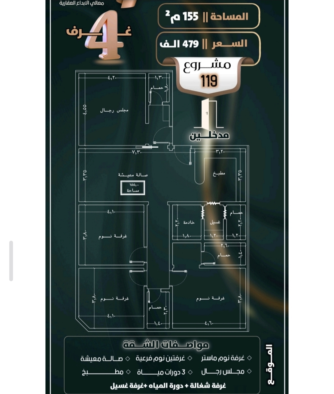- المواصفات: غرفة نوم ماستر، غرفتين نوم فرعية، صالة معيشة، مجلس رجال، مطبخ، 3 دورات مياه، وغرفة خادمة مع دورة مياه وغرفة غسيل.