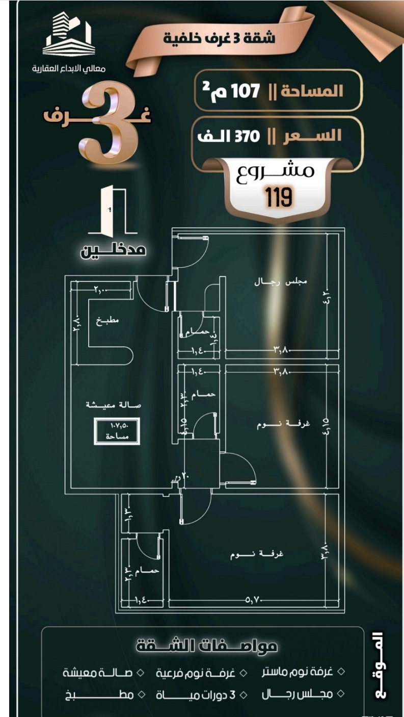 - المواصفات: غرفة نوم ماستر، غرفة نوم فرعية، صالة معيشة، مجلس رجال، مطبخ، و3 دورات مياه.