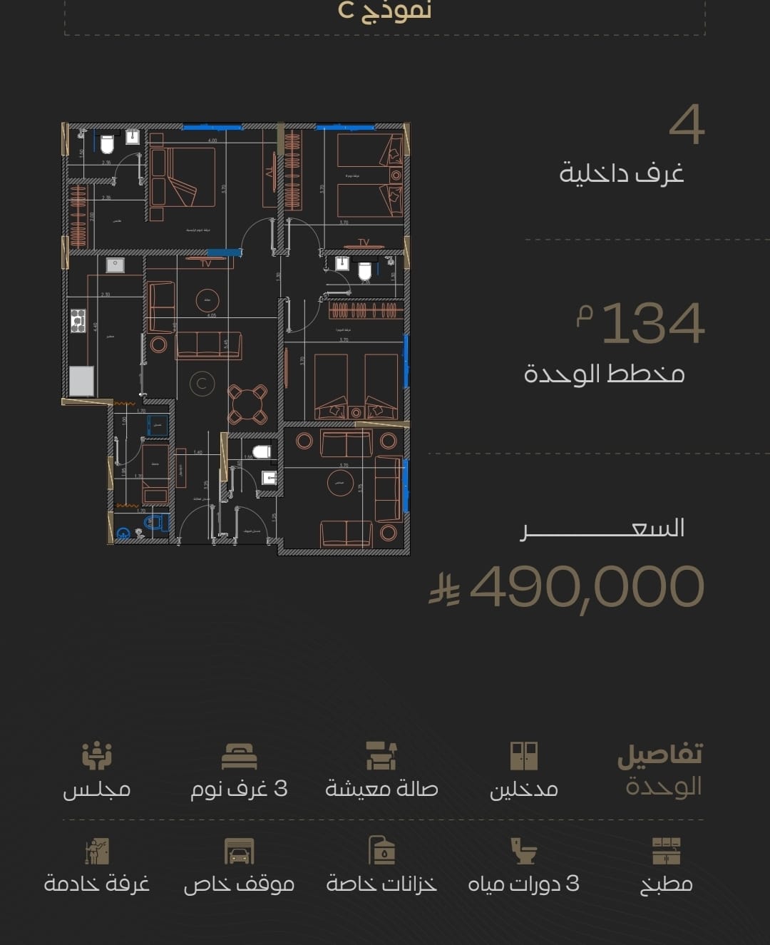 النماذج الأمامية (A & B): تتميز بإطلالات مباشرة وتضم 3 غرف نوم، مجلس، صالة معيشة، 3 دورات مياه، مطبخ، وتراس خاص. (اربع غرف امامية ببلكونه مساحة 129 متر مربع) بـ 495 ألف